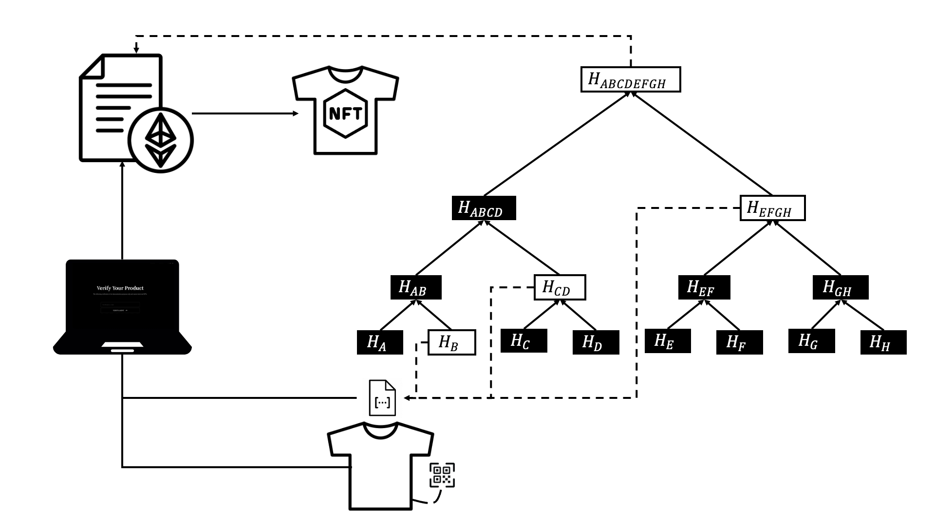 We use Merkle tree verification to put product information on the blockchain. The root of the Merkle tree are pre-stored in the brand's smart contract. During the verification process, the system first hashes the user's verification code to generate a leaf node of the Merkle tree, then calculates the corresponding Merkle tree proof array. These data are inputted as parameters into the smart contract, completing the verification process and ensuring accuracy and immutability.